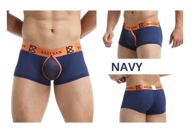 Men's sexy underwear ice silk mesh perfortaed quick-dry pouch boxer briefs underpants Navy Blue #KX010PJ
