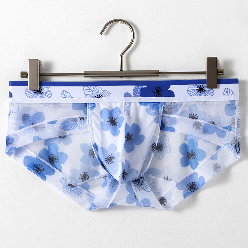 2PK Men's sexy underwear lingerie sheer mesh gauze floral pouch briefs underpants Blue 3061SJ